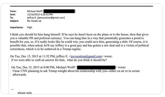 Among the revelations was a December 2015 exchange between Michael Wolff and Jeffrey Epstein that demonstrated deliberate calculation over Trump’s public image. Wolff warned Epstein that CNN planned to question Trump about their association during a Republican primary debate. In his response, Wolff advised, “I think you should let him hang himself. If he says he hasn’t been on the plane or to the house, then that gives you a valuable PR and political currency.” Wolff added, “You can hang him in a way that potentially generates a positive benefit for you, or, if it really looks like he could win, you could save him, generating a debt.” The email suggested Epstein’s knowledge of Trump’s activities could serve as leverage for either damage or protection depending on political outcomes.