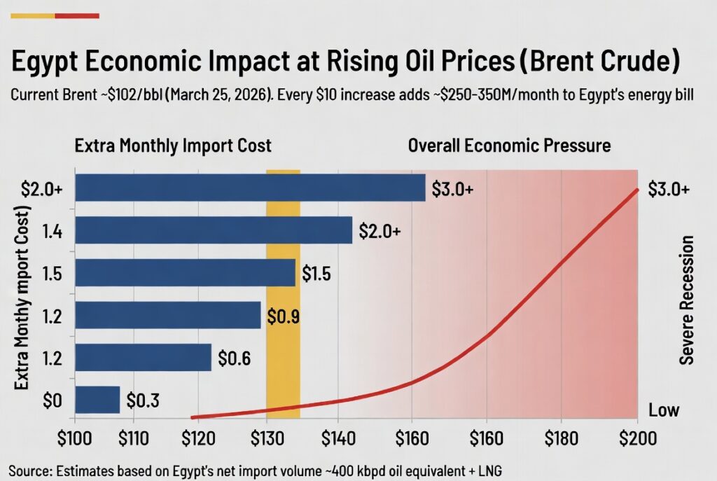 Current Brent ≈ $100/bbl (volatile; traded $98-104 today amid ceasefire hopes, but geopolitical premium remains). Egypt imports net ~250-300 kbpd oil equivalent + LNG equivalent to another ~150-200 kbpd oil. Rough rule: every $10/bbl sustained rise = +$250-350 million/month extra import bill (plus subsidy leakage).