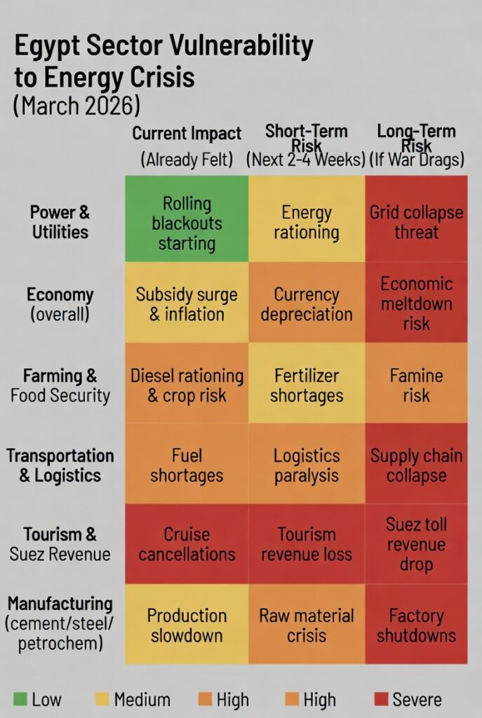 Bottom line: Egypt is in survival mode — not collapse yet, but the margin for error is razor-thin. The government’s early conservation moves are smart short-term damage control, but sustained war = structural energy crisis that will force painful choices (deeper subsidy reform, accelerated renewables, or heavy reliance on Gulf allies/US cargoes).