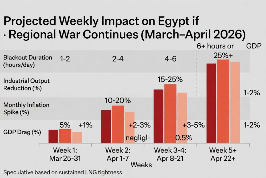| Week 3-4 (Apr 8–21) | If no new US/European cargoes secured → effective 20-25% gas shortfall. | Blackouts 4-6 hrs/day. Industry output -15-25%. Farming irrigation diesel rationed. Transportation fuel queues possible. Inflation +3-5% monthly. EGP devaluation pressure. |